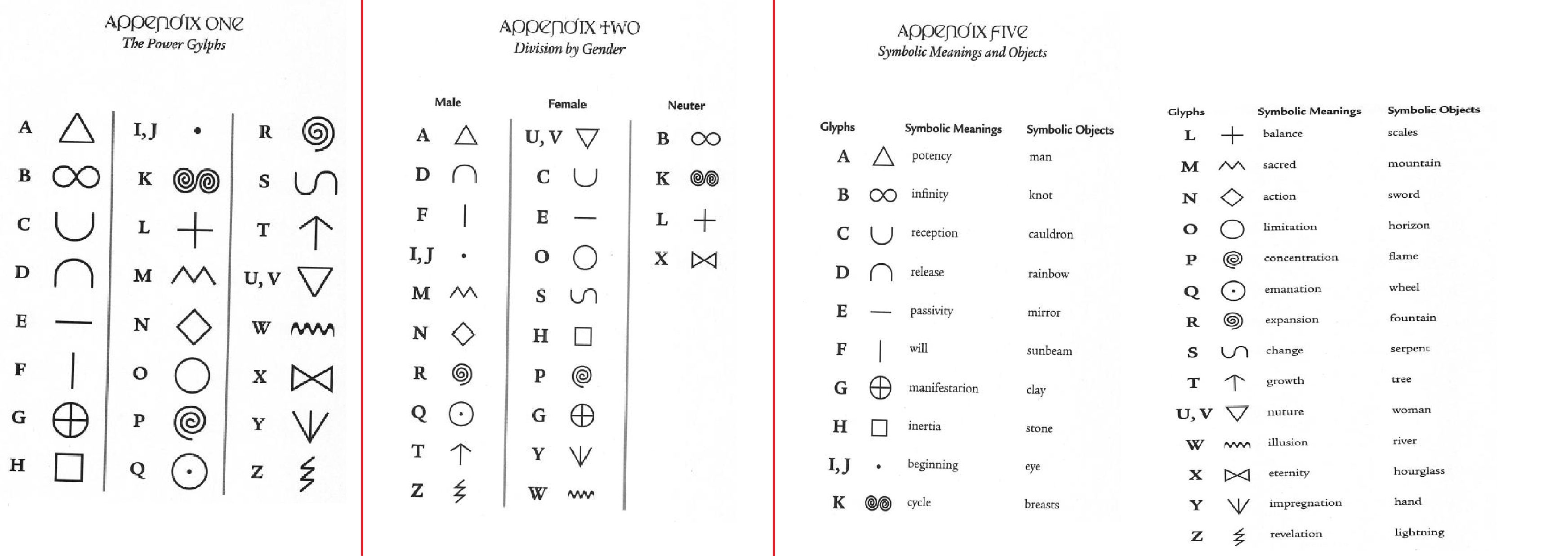 - O sigilo "público" é composto de glifos que representam idéias que o usuário pode ou não tentar interpretar por si, e não das letras que compõe a fórmula.